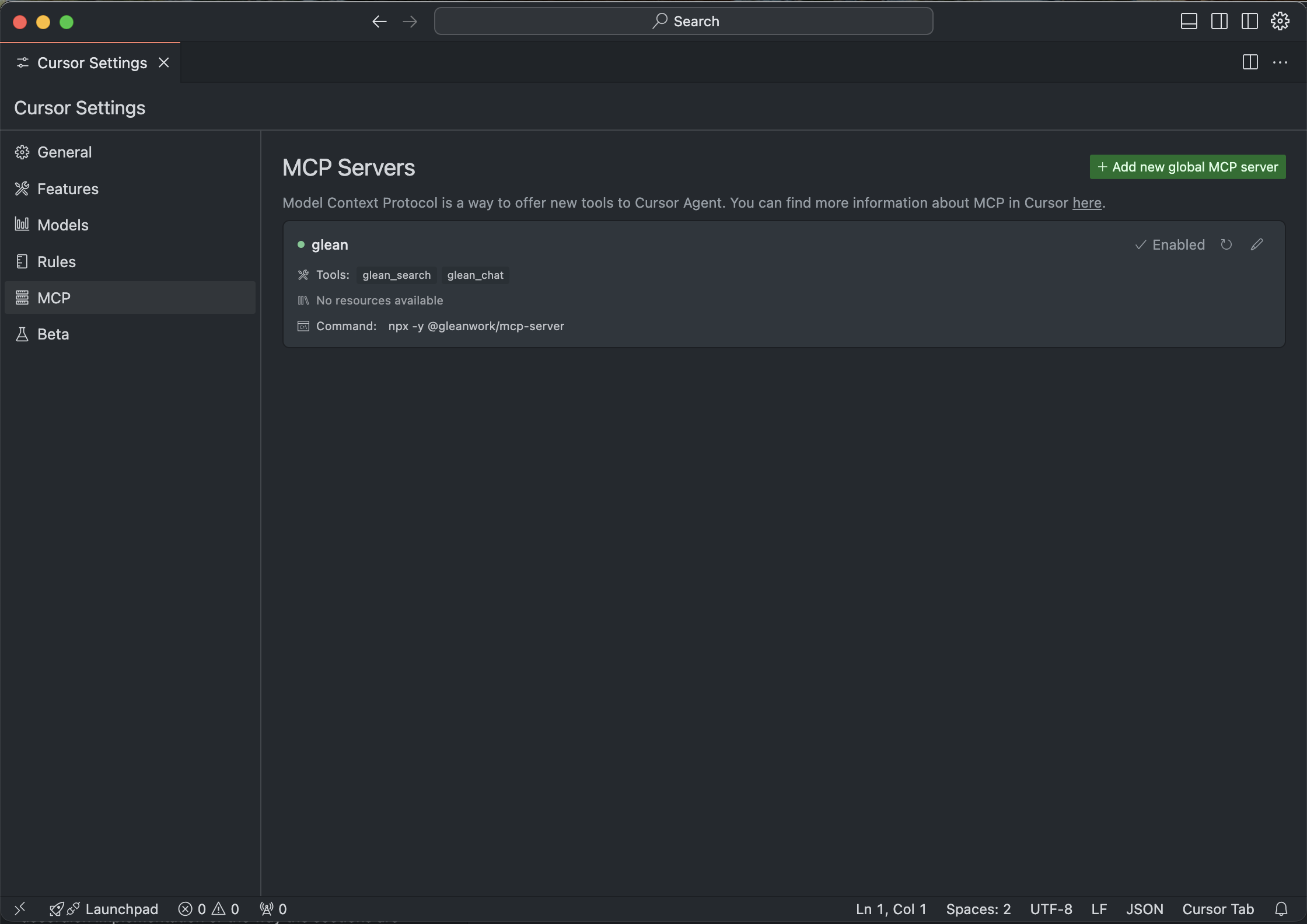 Run the following command to configure Cursor to use Glean's MCP server. This will add a new MCP server to Cursor's settings.